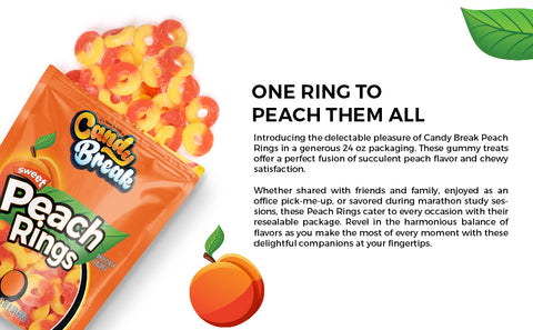 - Playfully Shaped Delight: Step into a new realm of snacking pleasure with our Candy Break Fruity Sweet Peach Rings Gummy Candy. The charming ring shape adds a touch of whimsy, making each bite visually appealing and irresistibly enjoyable.