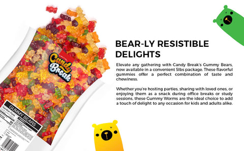 - Playful Gummy Treats: Candy Break Gummi Bears transform snacking with their bear shape. These candies are not just delicious but also visually captivating, adding an element of excitement to each bite. Let your creativity soar as you savor this one-of-a-kind candy adventure.