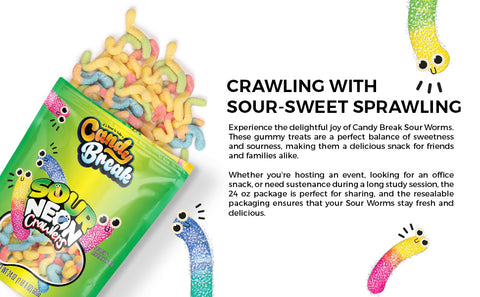 - Embark on a Sour Neon Adventure: Candy Break Sour Neon Worms Gummy Candy brings the perfect blend of sour and sweet in resealable pouches. Loved by all ages, these gummies redefine snacking joy for kids and grown-ups alike.