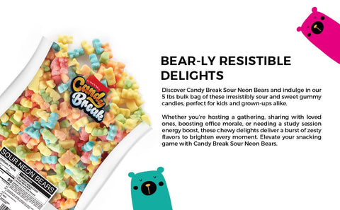 - Sourly Sweet Adventure: Embark on a journey with Candy Break Sour Neon Bears a 5-pound bag brimming with delight. These gummies, striking a balance between sour and sweet, redefine snacking joy for everyone.