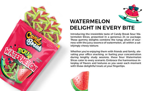 - Playful Gummy Treats: Candy Break Sour Watermelon Slices transform snacking with their watermelon shape. These candies are not just delicious but also visually captivating, adding an element of excitement to each bite. Let your creativity soar as you savor this one-of-a-kind candy adventure.