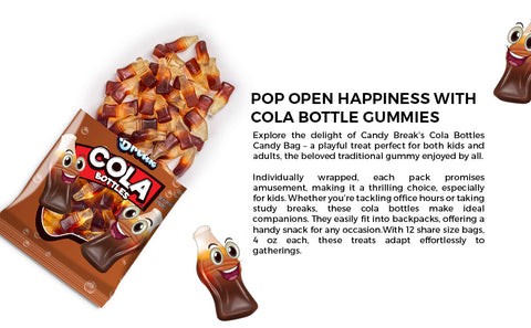 - Ideal for All Ages: Elevate your taste experience with Candy Break Cola Bottles Gummy Candy, meticulously crafted to delight diverse palates. These delectable treats transcend generations, perfect for cherished family gatherings, picnics, or whenever you crave a touch of cola-inspired paradise.